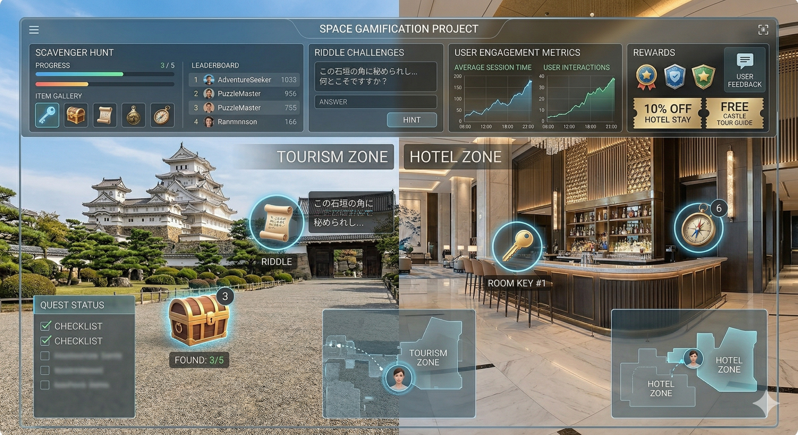 - 🎮 空間のゲーミフィケーション 観光地やホテルのバーチャルツアー内に「隠しアイテム(宝探し)」や謎解き要素をプログラミング。滞在時間とユーザーエンゲージメントを劇的に跳ね上げます。