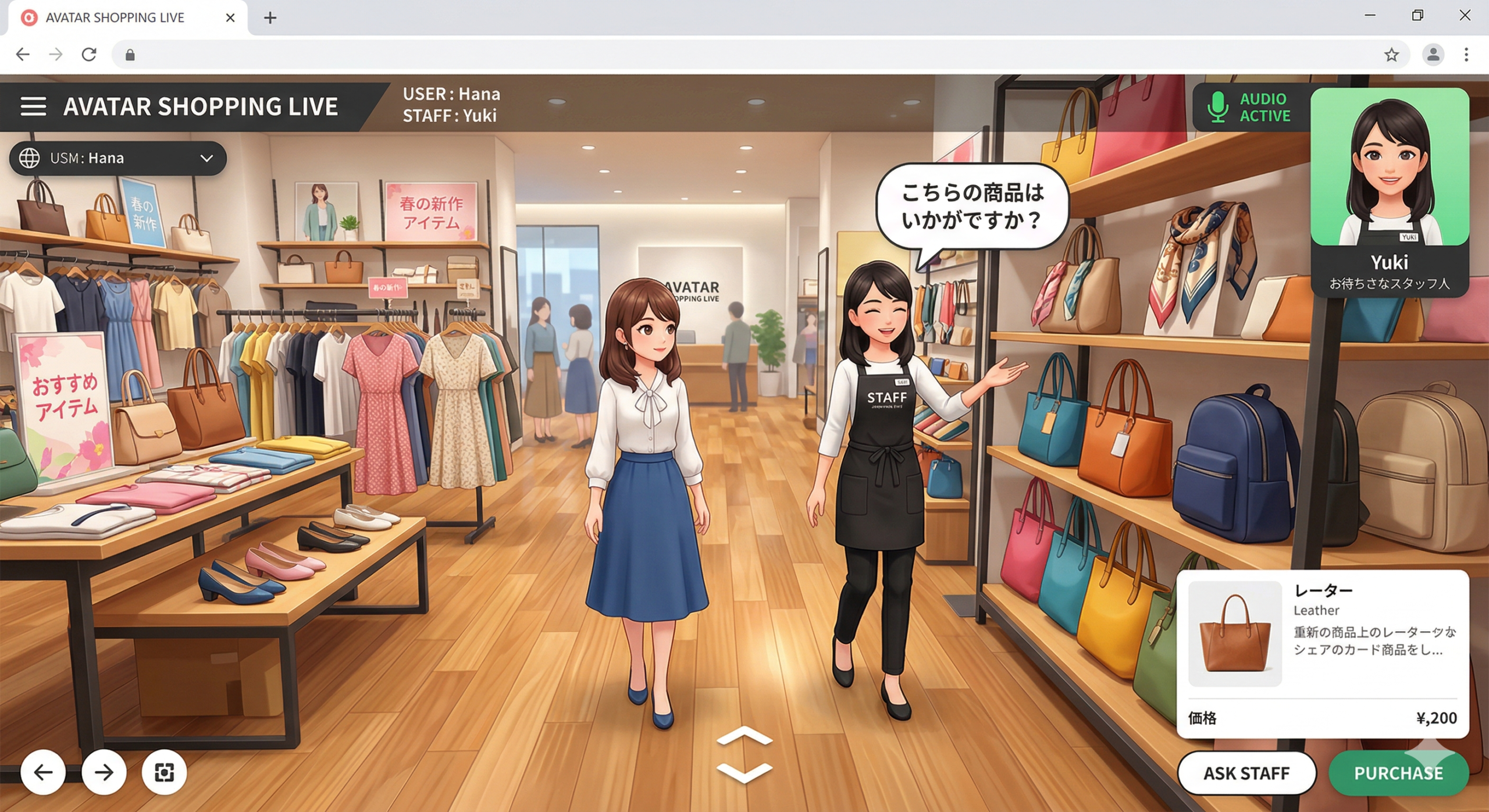 - 👥 アバターオンライン接客 お客様がアクセスすると、スタッフのアバターも同じ空間に登場。「こちらの商品はいかがですか?」と、音声通話付きで一緒に店内を歩きながら接客できます。